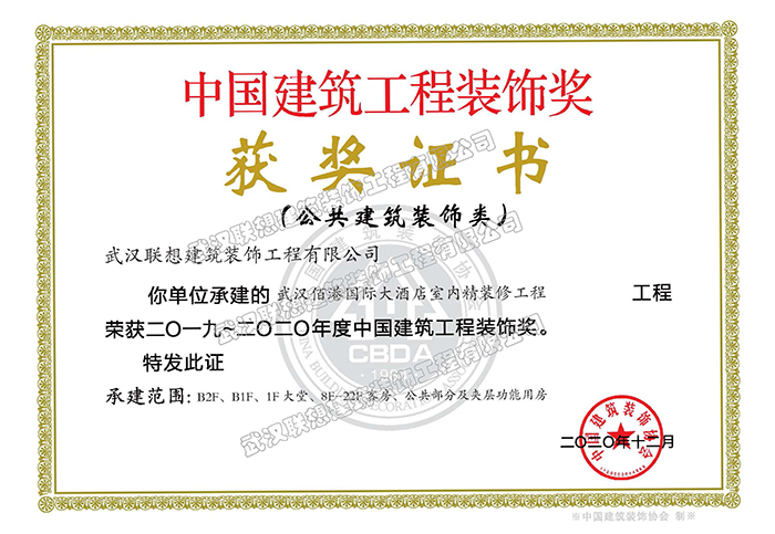 2019-2020年度中國建筑裝飾獎(jiǎng)(武漢佰港國際大酒店室內(nèi)精裝修工程)