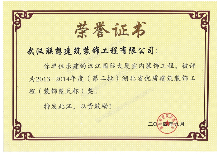 2013-2014年度湖北省優(yōu)質(zhì)建筑裝飾工程楚天杯(漢江國際大廈室內(nèi)裝飾工程)