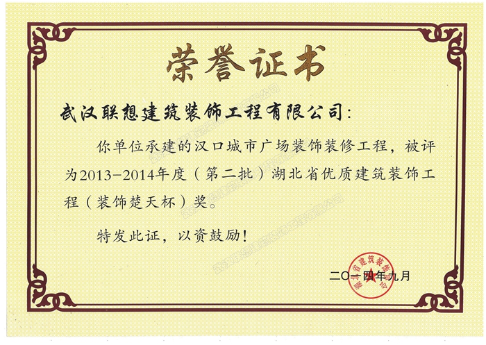 2013-2014年度湖北省優(yōu)質(zhì)建筑裝飾工程楚天杯(漢口城市廣場裝飾裝修工程)