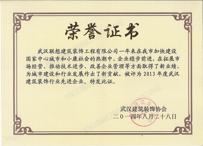 2013年度武漢建筑裝飾行業(yè)先進(jìn)企業(yè)