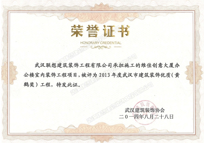2013年度武漢市建筑裝飾優(yōu)質(zhì)工程黃鶴杯(維佳創(chuàng)意大廈辦公樓室內(nèi)裝飾工程)