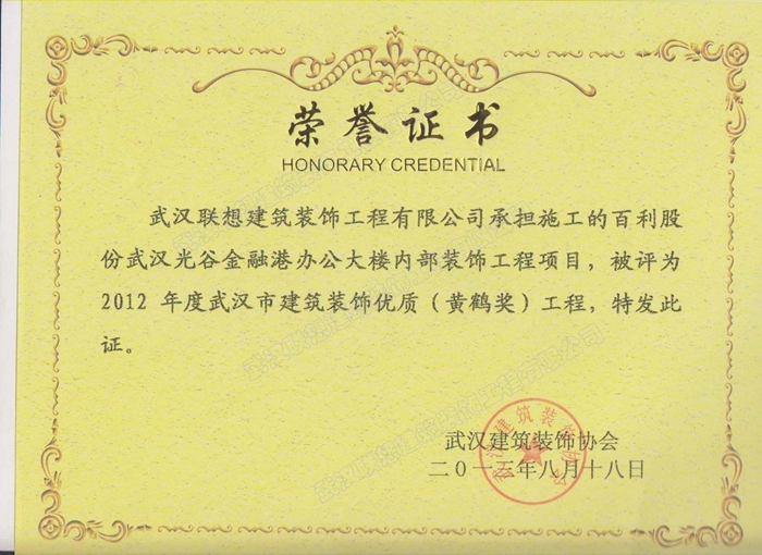 2012年度武漢市建筑裝飾優(yōu)質(zhì)工程黃鶴杯(武漢光谷金融港辦公大樓內(nèi)部裝飾工程)