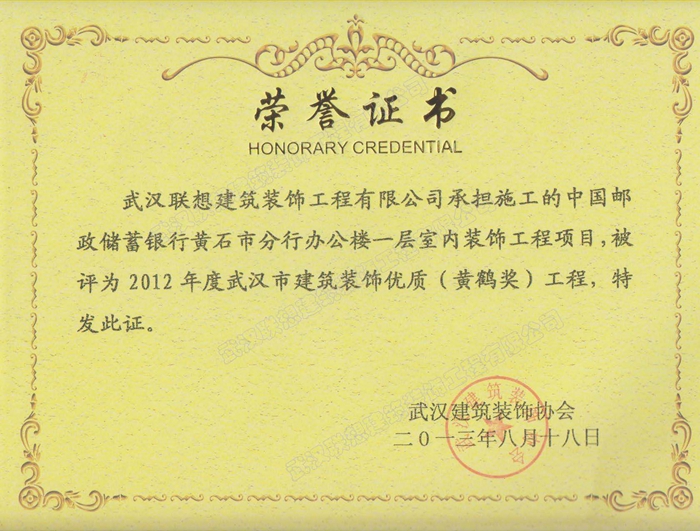 2012年度武漢建筑裝飾優(yōu)質(zhì)工程黃鶴杯(中國郵政儲蓄銀行黃石市分行室內(nèi)裝飾工程)
