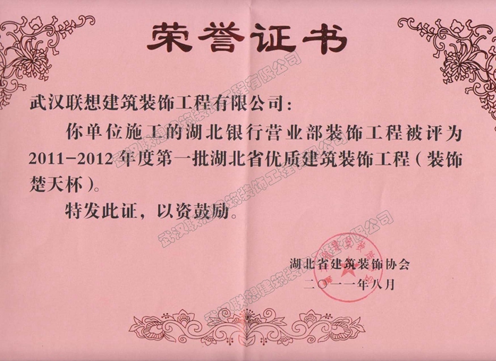 2011-2012年度湖北省優(yōu)質(zhì)建筑裝飾工程楚天杯(湖北銀行營業(yè)部裝飾工程)
