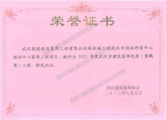 2011年度武漢建筑裝飾優(yōu)質(zhì)工程黃鶴杯(武漢市園林種苗中心培訓(xùn)中心裝飾工程)