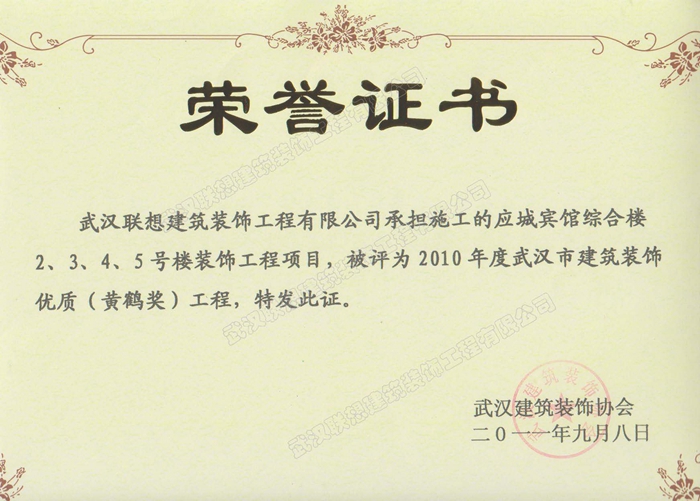 2010年度武漢建筑裝飾優(yōu)質(zhì)工程黃鶴杯(應(yīng)城賓館綜合樓2、3、4、5號樓裝飾工程)